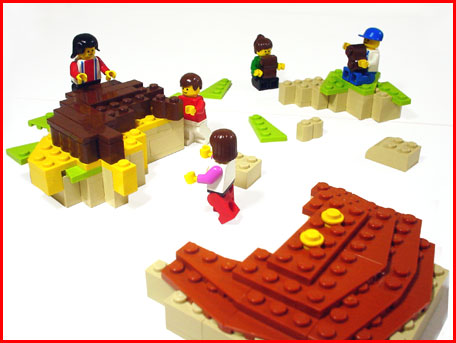 大変だぁ!ミニフィグがたかって来たぁ〜! 肉に座るなって! |
